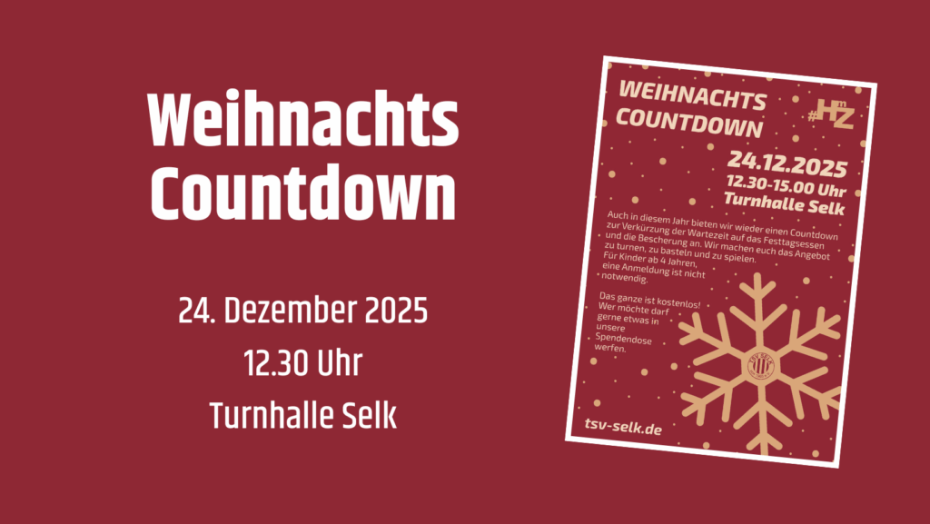 Weihnachtscountdown – 24.12.2025 Auch in diesem Jahr bieten wir wieder einen Countdown zur Verkürzung der Wartezeit auf das Festtagsessen und die Bescherung an. 🗓️ Wann? – 24.12.2025⏰ Uhrzeit? – 12.30 bis 15 Uhr🎄 Wo? – Turnhalle Selk (Kreisstraße 32, 24884 Selk) Wir machen euch das Angebot zu turnen, zu basteln und zu spielen. Für Kinder […]